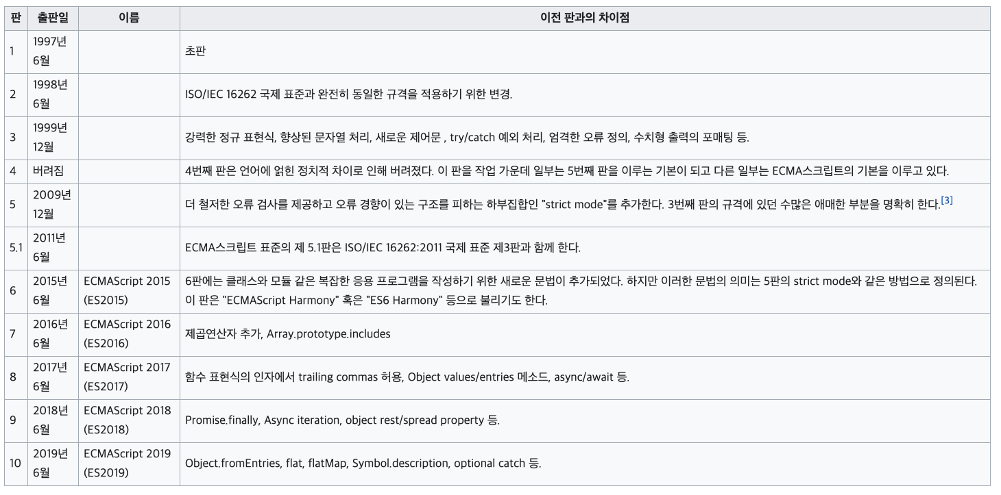 ES2015๋ถํฐ๋ ์ฌ์์ ๋งค๋ ๊ฐ์ ํ๊ธฐ๋ก ํ์ต๋๋ค. ๋ฐ๋ผ์ ์๋ ECMAScript4, ECMAScript5, ECMAScript6์ฒ๋ผ ์ซ์๋ฅผ๋ถ์ด์ง ์๊ณ , ECMAScript2015, ECMAScript2017 ์ฒ๋ผ ์ฐ๋๋ฅผ ๋ถ์ฌ์ ๋ถ๋ฅด๊ฒ ๋์์ต๋๋ค.