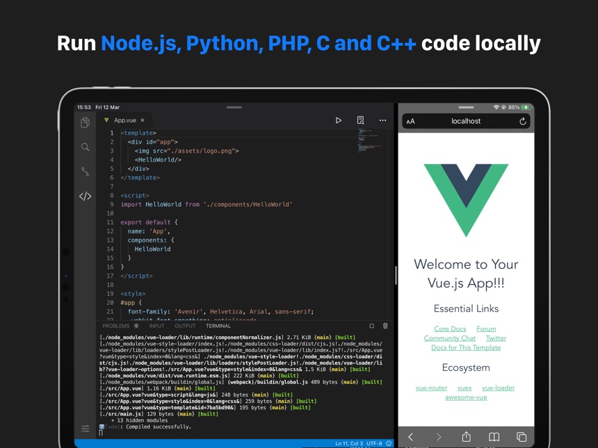 We built Code App to bring desktop-like code editing experience to iPadOS. See the project's source code, roadmap, discussion, and documentation on GitHub: github.com/thebaselab/codeapp Features: Local Node.js, Python, PHP, C, C++ runtime • Run Python