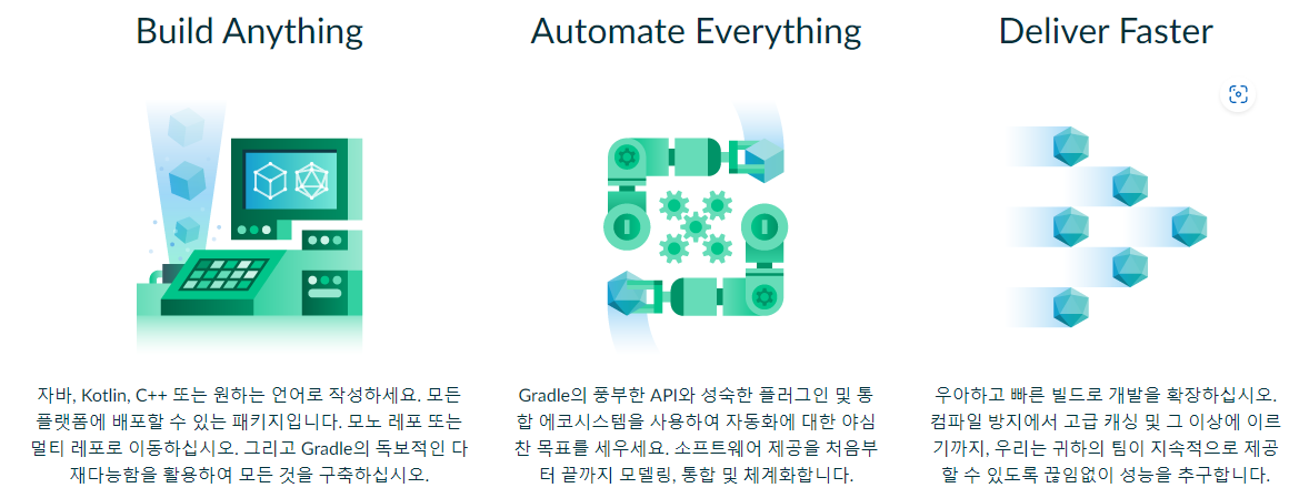Gradle์ ๊ฑฐ์ ๋ชจ๋ ์ ํ์ ์ํํธ์จ์ด๋ฅผ ๋น๋ํ ์ ์์ ๋งํผ ์ ์ฐํ ์คํ ์์ค ๋น๋ ์๋ํ ๋๊ตฌ์ ๋๋ค. Gradle์ ๋น๋ํ๋ ค๋ ํญ๋ชฉ์ด๋ ๋น๋ ๋ฐฉ๋ฒ์ ๋ํด ๊ฑฐ์ ๊ฐ์ ํ์ง ์์ต๋๋ค. ๋ฐ๋ผ์ Gradle์ ํนํ ์ ์ฐํฉ๋๋ค.