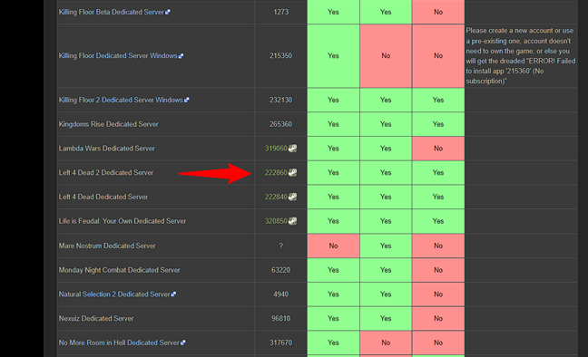 ์ด์ ๋ก๊ทธ์ธํ์ผ๋ฏ๋ก ๊ฒ์ ์๋ฒ ์ค์น๋ฅผ ์์ํ ์ ์์ต๋๋ค. ๊ทธ๋ฌ๋ SteamCMD์์ ๊ทธ๋ ๊ฒ ํ๋ ค๋ฉด ๊ฒ์์ Steam ์ ํ๋ฆฌ์ผ์ด์ ID๋ฅผ ์์์ผ ํฉ๋๋ค. ID๋ฅผ ํ์ธํ๋ ค๋ฉด ์น ๋ธ๋ผ์ฐ์ ๋ฅผ ์ฌ์ฉํ์ฌ Steam ์ ์ฉ ์๋ฒ ๋ชฉ๋ก ์นํ์ด์ง๋ก ์ด๋ํ์ธ์. ๊ทธ๊ฒ์ ์ํ๋ ๊ฒ์์ ์ฐพ์ผ์ญ์์ค. ์ฑ์ ์ฐพ์ผ๋ฉด ๊ฒ์์ ์ฑ ID๋ฅผ ๋ณต์ฌํ๊ฑฐ๋ ์ ์ด ๋ก๋๋ค. ์๋ฅผ ๋ค์ด Left 4 Dead 2์ ์ฑ ID ๋ 222860์ ๋๋ค.