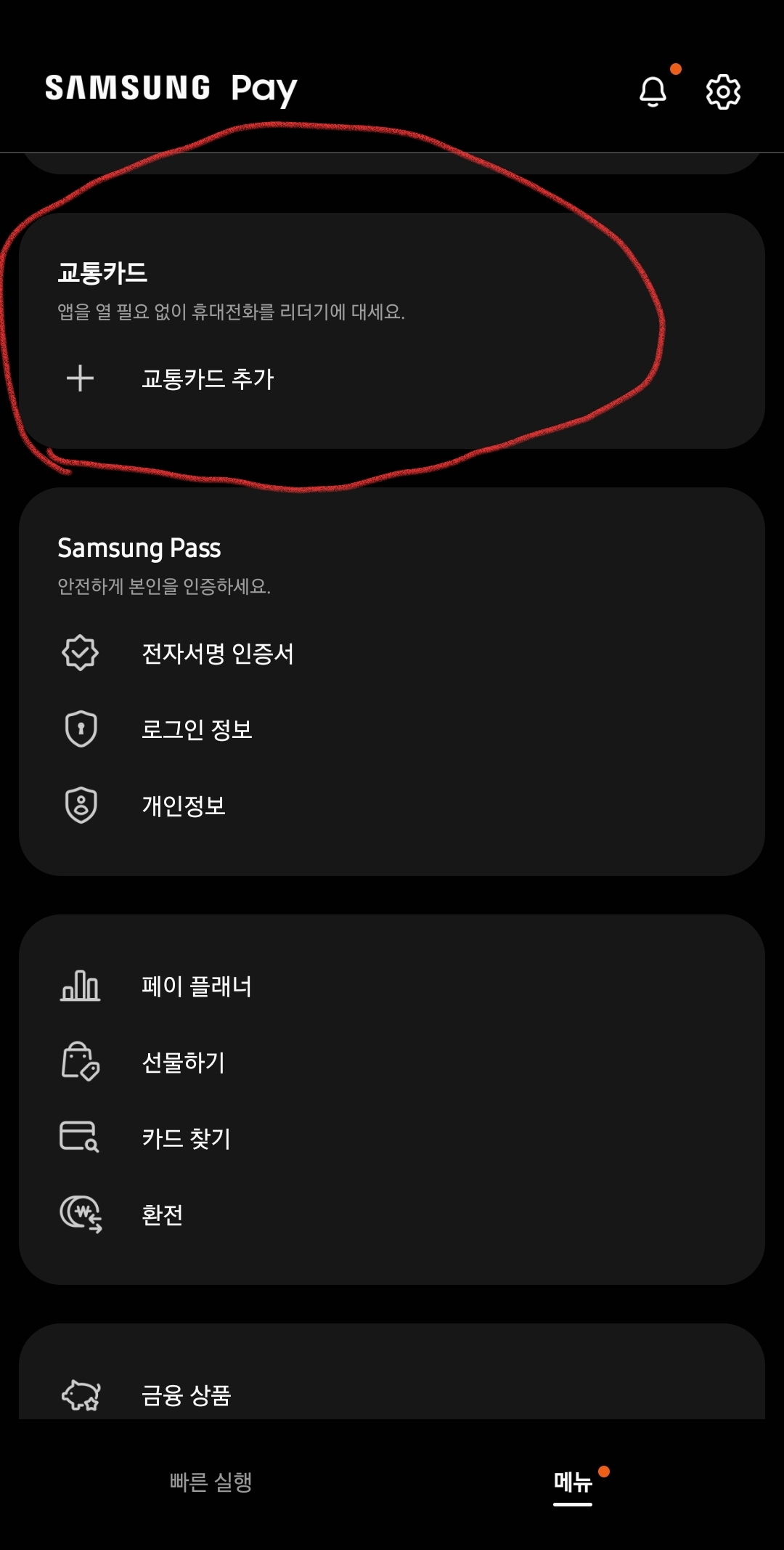 ๊ฐ๋จํ ๋ฐฉ๋ฒ์ผ๋ก๋ ๊ฐค๋ญ์(์๋๋ก์ด๋)๋ฅผ ์ฌ์ฉํ๊ณ ์๋ค๋ฉด ์ผ์ฑํ์ด๋ฅผ ํตํด ๊ตํต์นด๋๋ฅผ ์ฌ์ฉ๊ฐ๋ฅํฉ๋๋ค.