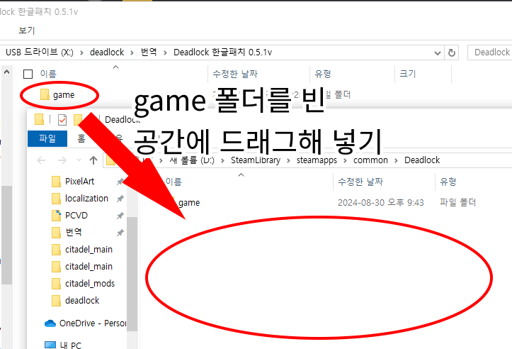 2. ์์ถํ์ผ ์์ game ํด๋๋ฅผ Deadlock ํด๋ ์์ ๋๋๊ทธํ๊ธฐ